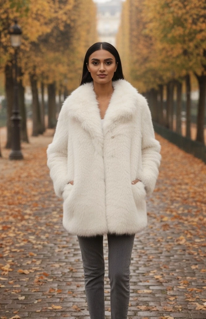 Hosszú, selymes műszőrméje és lágy krémszínű árnyalata modern kifinomultságot és ölelő melegséget sugároz – ideális a téli réteges öltözködés elegáns kiegészítéseként.